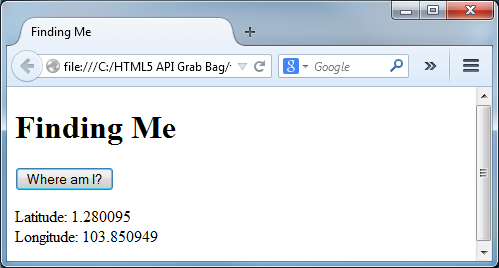 If you look into the code in the catchError() function, you would notice that this is the error message specified under the case of positionError.POSITION_UNAVAILABLE. The cause is obviously due to the network cable being unplugged and wireless being switched off. The catchError() function was invoked by the getCurrentPosition() method as it is not able to obtained any location information due to the broken network connection. (You may recover the network connection to your computer now.) Although this error handling parameter is optional, you should always include it as part of any geolocation code. This is one of the best practices to allow the program to fail gracefully as well as to keep the users informed of any run-time errors.
